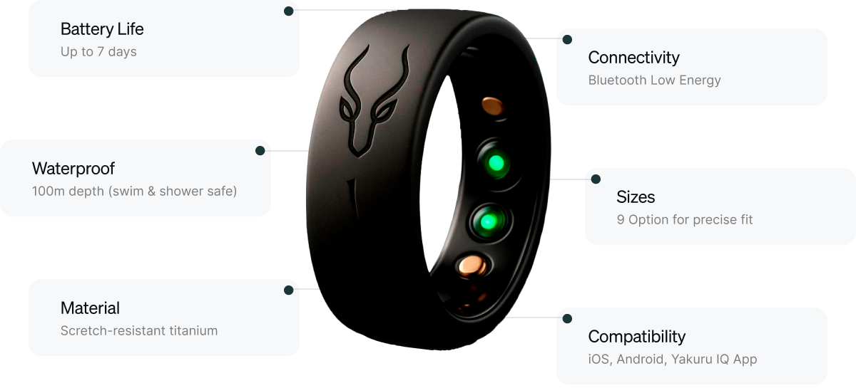 From a titanium shell to 7-day battery life, the Yakuru Ring is designed to be as tough, precise, and versatile as the people who wear it — waterproof, lightweight, and seamlessly connected to iOS, Android, and the Yakuru IQ app.